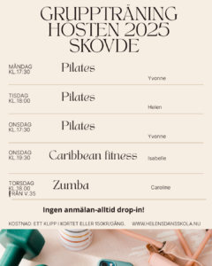 Zumba – En dansbaserad gruppträning till härliga latinamerikanska rytmer. Salsa, merengue, cumbia och reaggeton är några av stilarna man får testa på. Passar alla, både äldre och yngre som tycker om att röra sig till musik. Kom, dansa och njut!