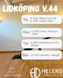 Dance workout – Glädje- & fartfyllt träningspass där du tränar din kondition till gammal och ny musik. Några låtar har lite mer avancerad koreografi men det flesta är enkla att följa med i redan från början med många repetitioner.